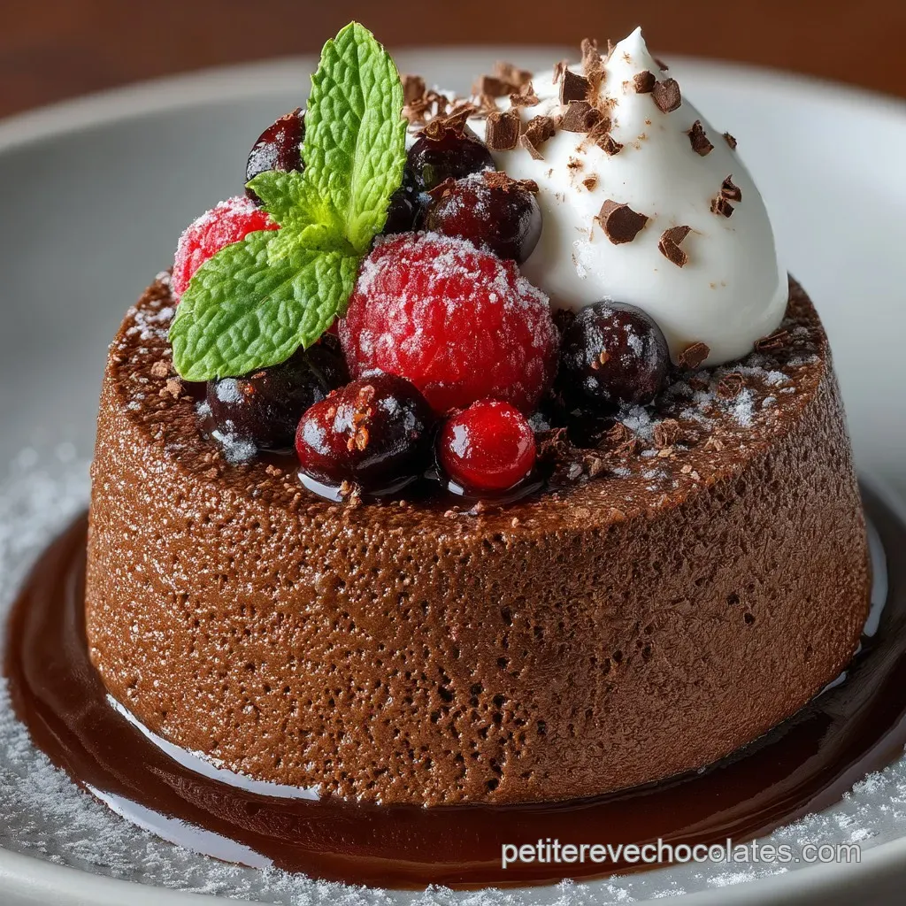 Pour l'accompagner, la simplicité est de mise : quelques fruits rouges frais (framboises, groseilles) apportent une acidité rafraîchissante qui coupe le gras du chocolat.